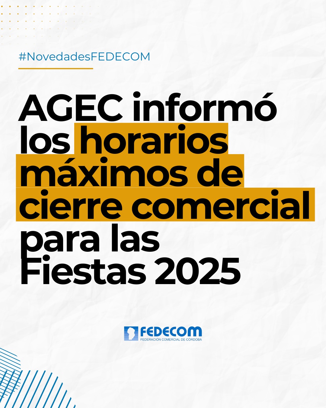 La Asociación Gremial de Empleados de Comercio (AGEC) de Córdoba informó que continúan vigentes las Resoluciones N° 253/2005, 505/2008, 322/2009 y 120/2010, que establecen los horarios máximos de cierre de los establecimientos comerciales con motivo de las próximas Fiestas.