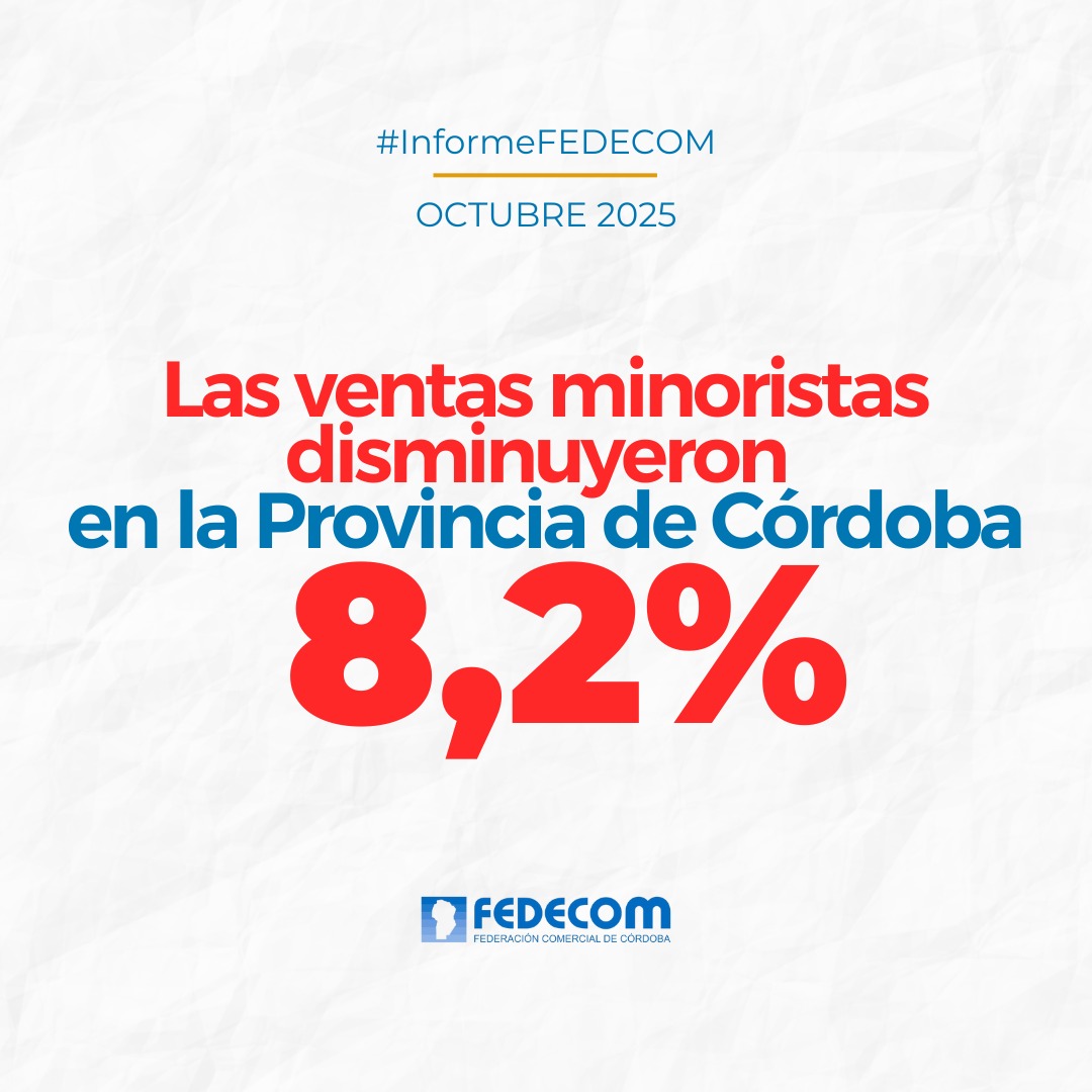 Las ventas minoristas de los comercios pymes de Córdoba cerraron octubre con una baja del 8,2% interanual, según el relevamiento realizado por la Federación Comercial de Córdoba (FEDECOM) junto a sus Cámaras y Centros Comerciales adheridos.