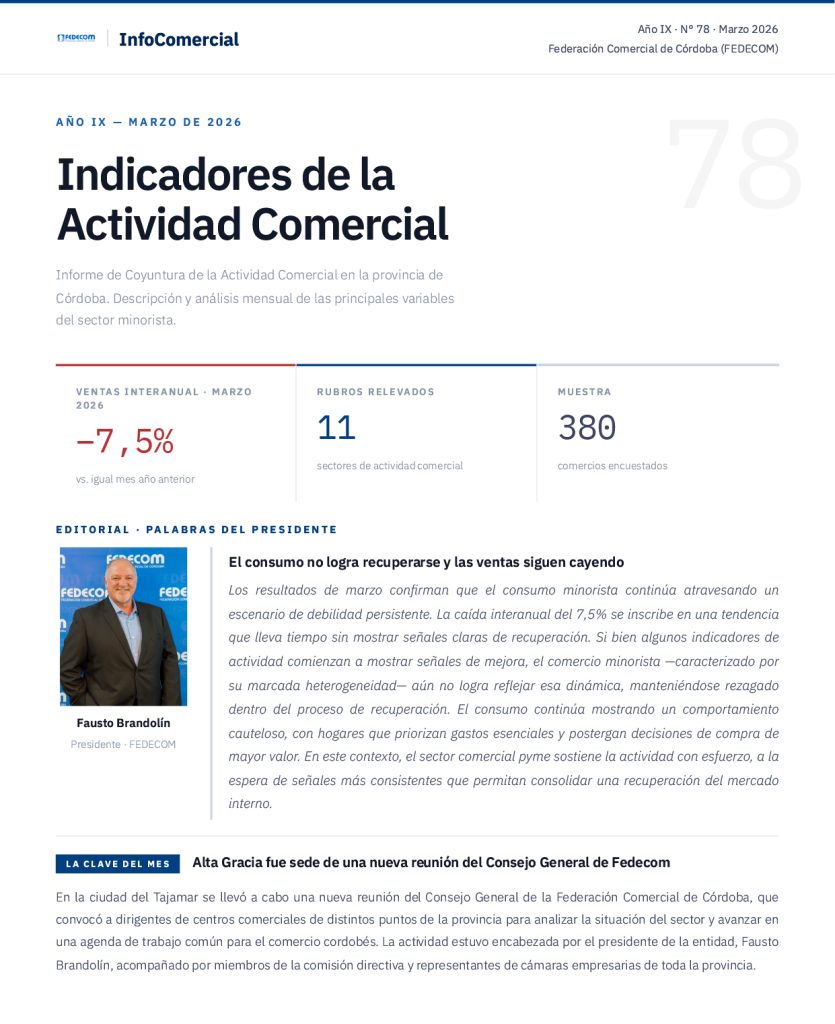 “Los resultados de marzo confirman que el consumo minorista continúa atravesando un escenario de debilidad persistente. La caída interanual del 7,5% se inscribe en una tendencia que lleva tiempo sin mostrar señales claras de recuperación”, expresó el presidente de FEDECOM, Fausto Brandolín