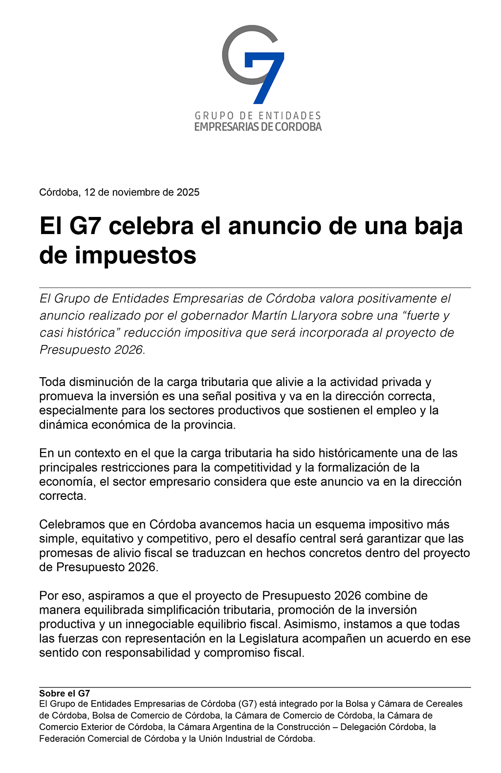 El Grupo de Entidades Empresarias de Córdoba, del que Fedecom forma parte, valora positivamente la decisión del gobernador Martín Llaryora de incorporar una reducción impositiva al Presupuesto 2026.